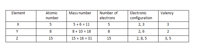 Elements their atomic, mass number,valency and electronic configuratio :